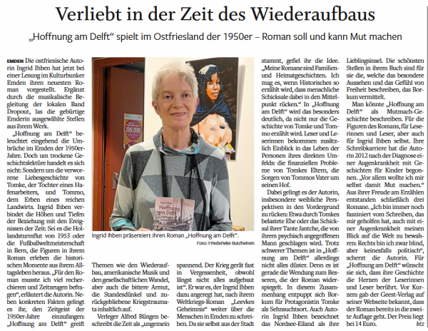 Ostfriesischer Kurier berichtet über Buch und Premiere von Ingrid Ihben 'Hoffnung am Delft' zum besseren Lesen Datei unten anklicken AnhangGröße Ostfriesischer Kurier594.28 KB