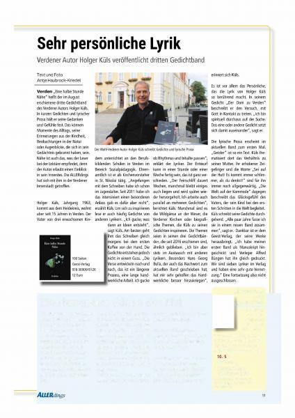 Presse stellt Holger Küls neuen Band 'Eine halbe Stunde Nähe' vor zum besseren Lesen bitte einfach die pdf-Datei öffnen AnhangGröße Lyrik Holger Küls ALLERdings S.11.pdf140.3 KB