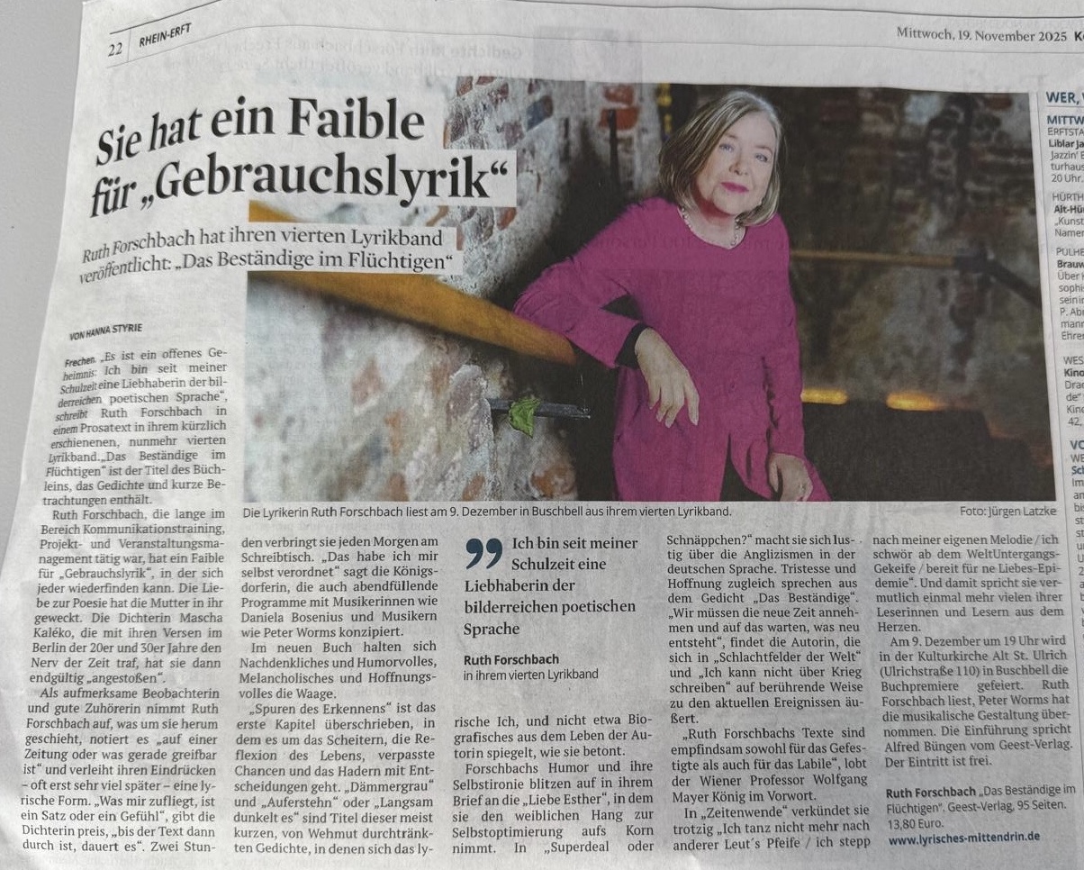 Der Kölner Stadtanzeiger berichtete vor der Buchpremiere von Ruth Forschbach