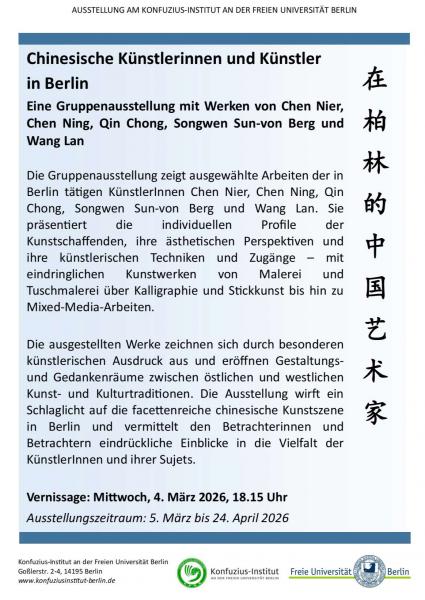 Vernissage Gruppenausstellung chinesischer Künstler*innen in Berlin (u.a. Wang Lan) am Konfuzius-Institit in Berlin veranstaltungsdatum: 4. März 2026Lesungen: "Projekte"