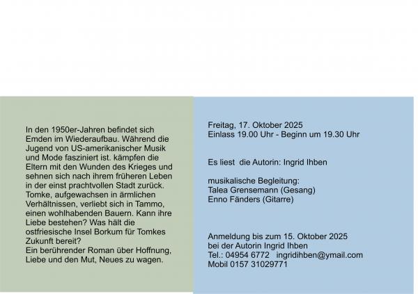 Buchpremiere Ingrid Ihben - Hoffnung am Delft am heutigen 17. Oktober um 19.30 Uhr im Kulturbunker Emden