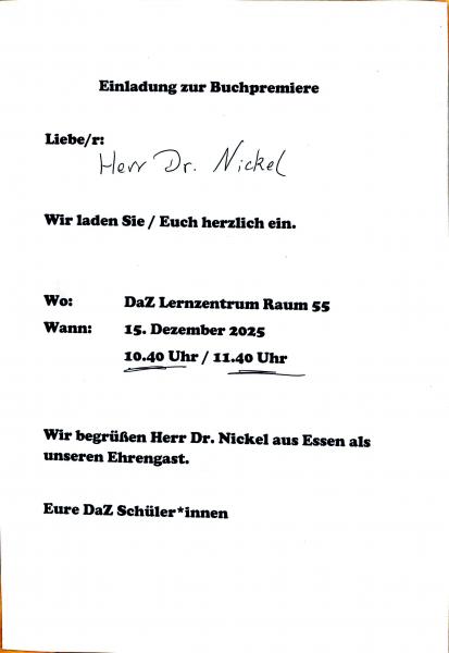 Eine ganz besondere PremiereEine schöne Überraschung hatte der Autor und Herausgeber der Essener Anthologien Artur Nickel in diesen Tagen in seinem Mail-Postkarten. Es war eine Einladung zu einer Buchpremiere an der Josef-Reding-Schule in Holzwickede. Drei DaZ-Klassen (Deutsch als Zweitsprache) hatten ihn eingeladen, um mit ihm gemeinsam ihren Erfolg zu feiern. Sie hatten im vergangenen Sommer zusammen für die neue Essener Anthologie "Mein Heute und Morgen an der Ruhr" eine Geschichte geschrieben und eingereicht. Mit Erfoilg! Der Text wurd gedruckt. Er war ja auch etwas Besonderes. Und so dürfte die gemeinsame Feier am heutigen Montag, dem 15. Dezember 2025, auch etwas ganz Besonderes werden.