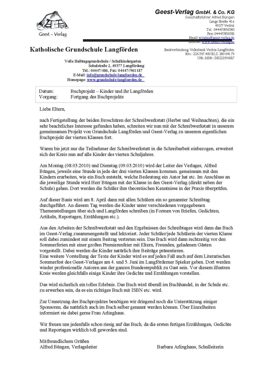 Fortgang des Buchprojektes mit der GS Langförden - Elternbrief