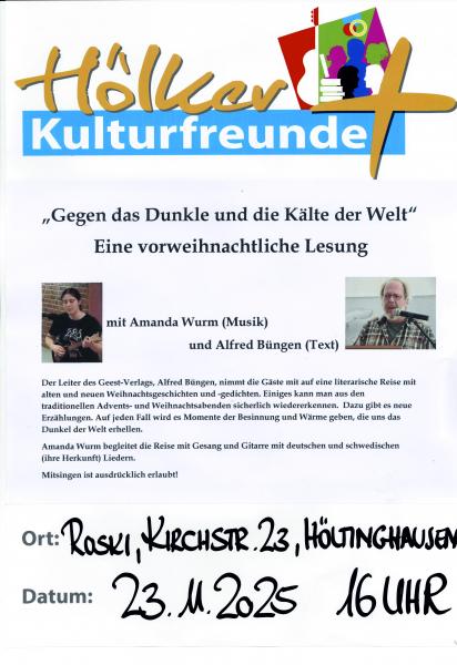 Gegen das Dunkle und die Kälte der Welt - Amanda Wurm und Alfred Büngen am 23.11. mit vorweihnachtlicher Lesung bei den Höller Kulturfreunden