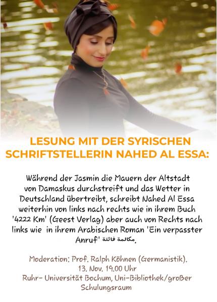 Lesung mit Nahed Al Essa am 13.11. um 19.00 Uhr in der Uni-Bibliothek der Ruhr Uni Bochum Al Essa, Nahed - Vier tausend zwei hundert zwei und zwanzig Kilometer. Geschichte und Gedichte. Mit einem Nachwort von Ralph Köhnen