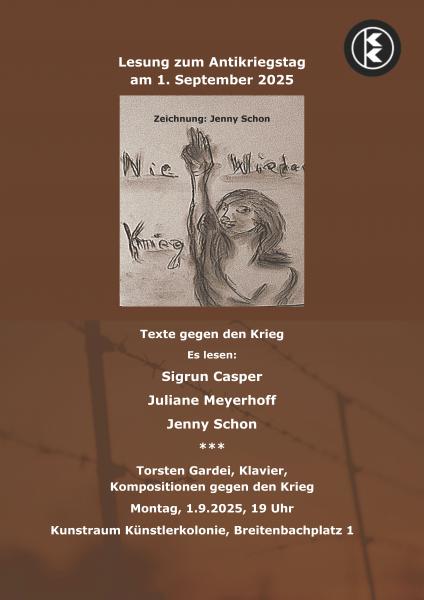 Lesung zum Antikriegstag am 1. September mit Jenny Schon u.a. im Kunstraum Künstlkerkolonie, Breitenbachplatz in Berlin