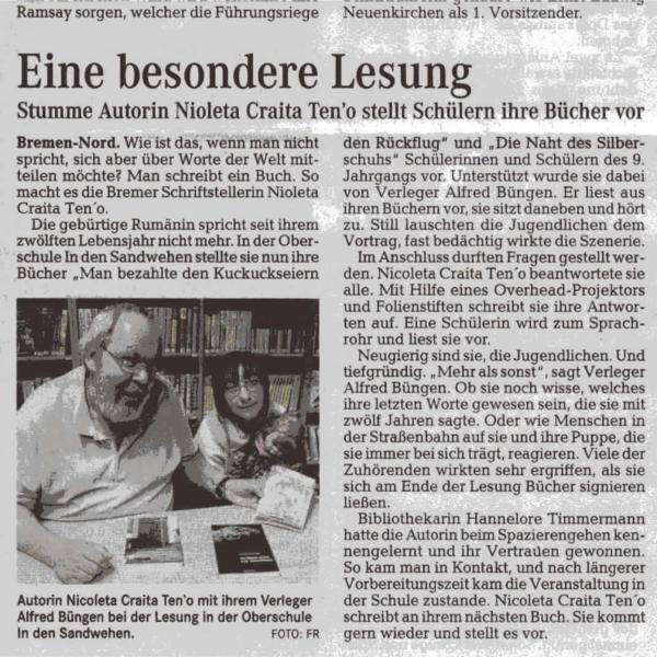 Presse berichtet über Lesung von Nicoleta Craita Ten'o in der Oberschule In den Sandwehen in Bremen