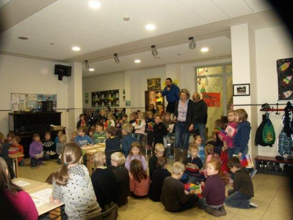 Zu Beginn des Schreibtages trafen sich alle Kindr und Betreuer im Forum der Schule. Der Schulleiter begrüßte die Kindr, Kollegen und Gäste. Verlagsleiter Alfred Büngen erläuterte noch einmal den Ablauf. Zur Stärkung der Schreibmotivation lasen drei Kinder aus der Schreibwerkstatt der GS Emstek eigene Texte.