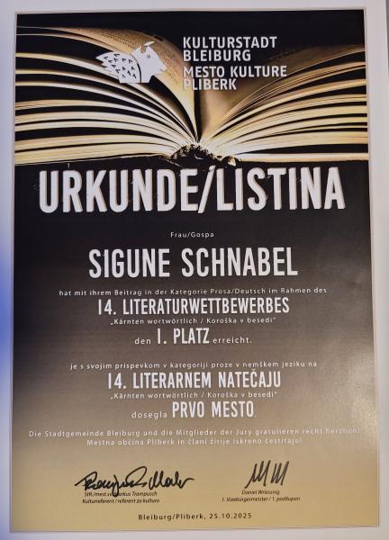 Sigune Schnabel gewann im 14. Literaturwettbewerb 'Kärnten wortwörtlich' den 1. Preis in der Kategorie Prosa