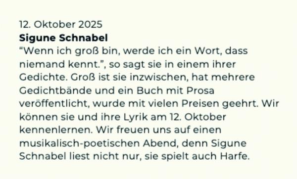 Sigune Schnabel - Lesung am 12.10. im Treffpunkt Eickel Salonabend mit Lyrik und Harfe in Herne