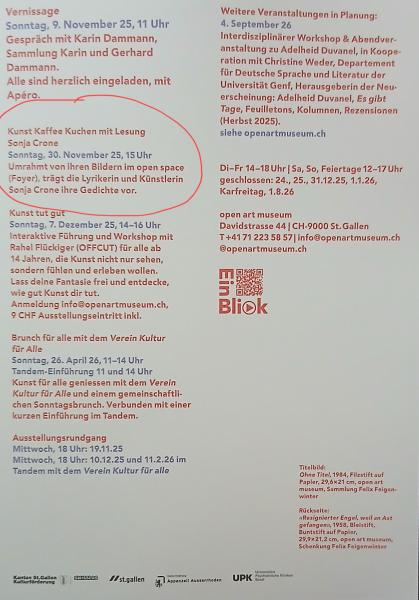 Sonja Crone liest am 30.11. umrahmt von ihren Bildern am 30.11. im openart-museum St. Gallen
