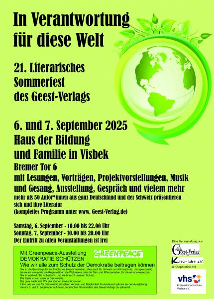 In Verantwortung für unsere Welt - Literarisches Sommerfest des Geest-Verlags am 6. und 7. September im Haus für Bildung und Familie - mit Greenpeace-Austellung Demokratie schützen, Lesungen, Gesprächen und vielem mehr